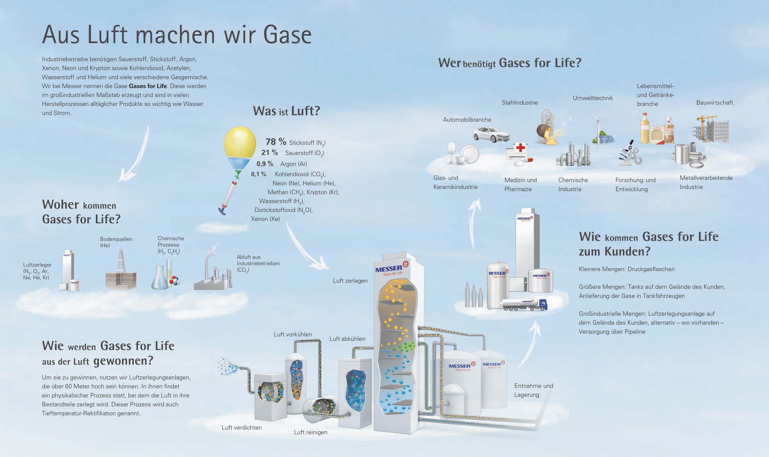 Seit über 110 Jahren verbindet sich mit dem Namen Messer Kompetenz rund um das Thema Gase. Messer erzeugt und liefert Sauerstoff, Stickstoff, Argon, Kohlendioxid, Wasserstoff, Helium,