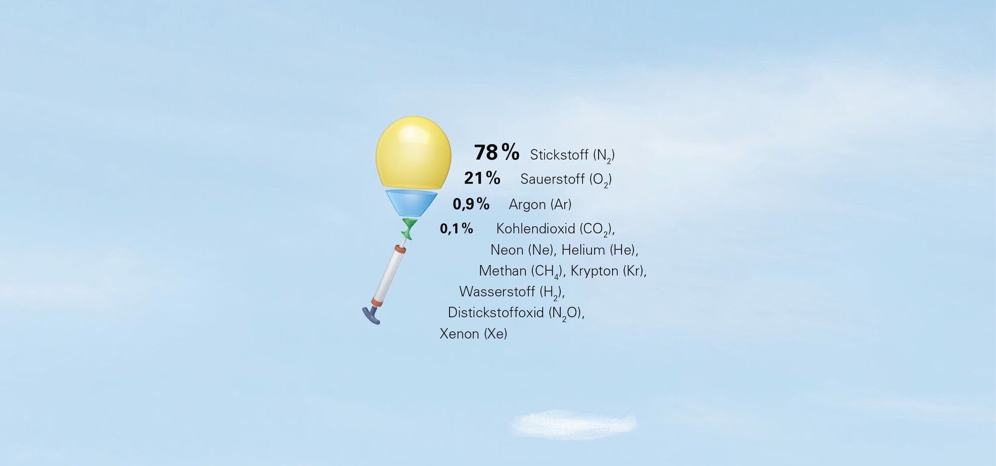 Was wir ganz allgemein als Luft bezeichnen, ist ein Gemisch aus verschiedenen Gasen, das die Atmosphäre unseres Planeten bildet. Luft besteht zu grössten Teilen aus Stickstoff und Sauerstoff, aus einem kleinen Anteil Argon und weiteren Gasen in kleinsten Mengen.