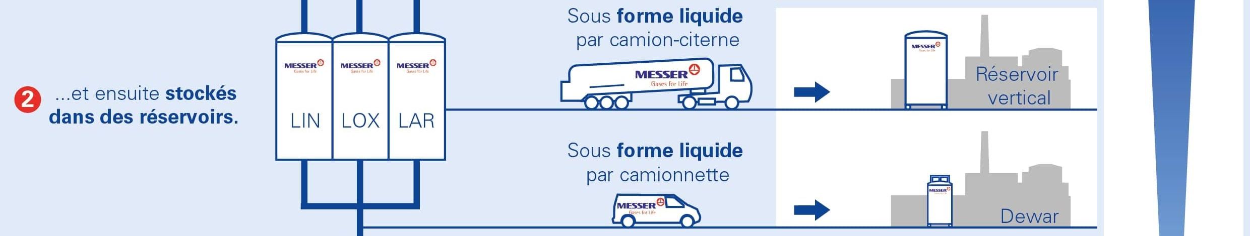 La possibilité la plus économique de livrer des quantités moyennes à grandes est l'approvisionnement par camion-citerne. Messer exploite une flotte de semi-remorques ou de conteneurs spéciaux pour les gaz cryogéniques comme l'azote, l'oxygène, l'argon, le dioxyde de carbone ou l'hélium. Ces gaz sont livrés sous forme liquide, car le volume de stockage nécessaire est nettement moins important qu'à l'état gazeux.