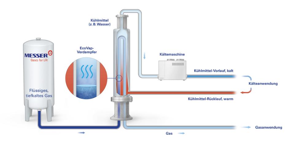 If gas is required in the production process, it does not pass via the conventional air evaporator which delivers the cold to the ambient air, instead it goes through the Ecovap evaporator. The energy required to evaporate the liquefied gas is removed from the coolant, thereby cooling down, thus relieving the refrigeration system. Ice and mist formation on the air vaporizers are not happening anymore and the temperature of the required gas is always constant regardless of the ambient conditions.