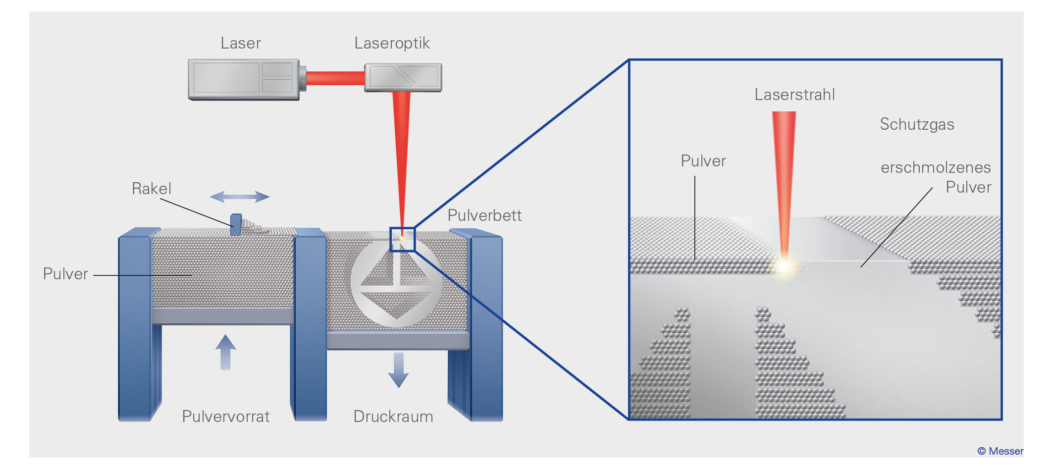 Beim Druck des Bauteils werden je nach Verfahren Schutzgase, Trägergase und Gase zum Kühlen unterschieden. Welches Gas mit welcher Reinheit benötigt wird, hängt bei den meisten Druckverfahren vom Werkstoff ab. Hierfür hat Messer die Produktlinie "Addline" eingeführt.